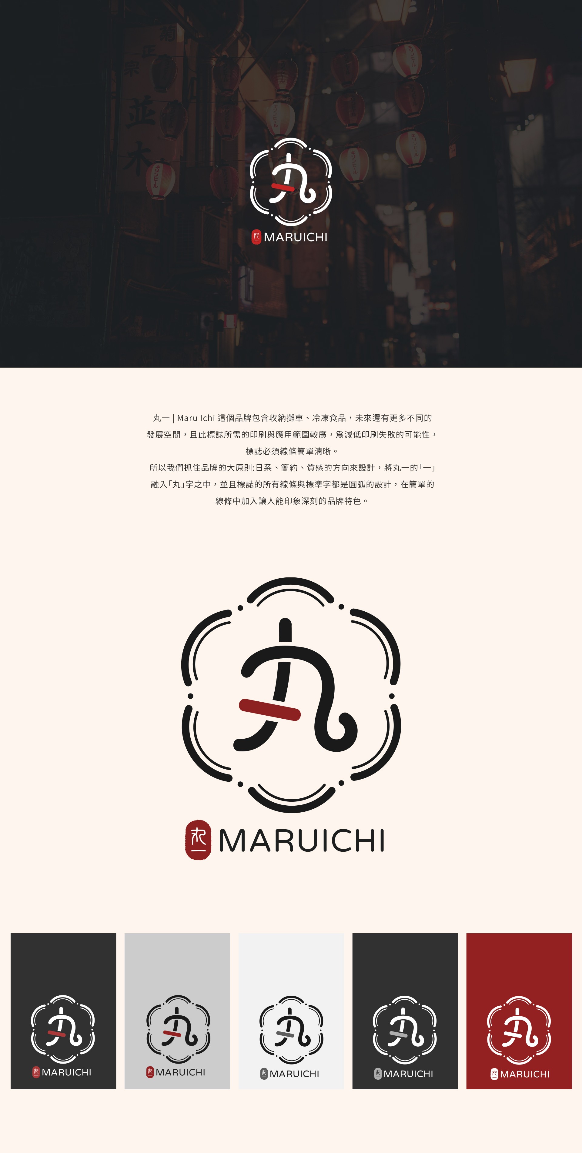 丸一|Maru Ichi 這個品牌包含收納摺疊車、冷凍食品,未來還有更多不同的發展空間,且此標誌所需的印刷與應用範圍較廣,為減低印刷失敗的可能性,標誌必須線條簡單清晰。所以我們抓住品牌的大原則:日系、簡約、質感的方向來設計,將丸一的「一」融入「丸」字之中,並且標誌的所有線條與標準字都是圓弧的設計,在簡單的線條中加入讓人能印象深刻的品牌特色。