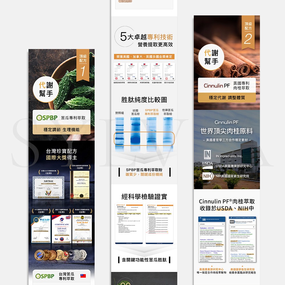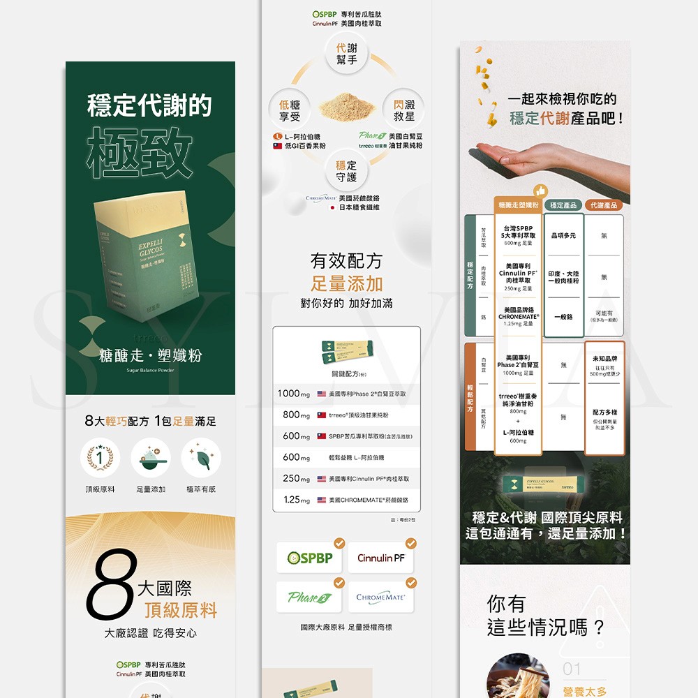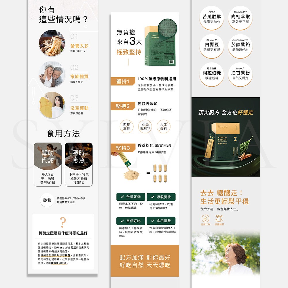 「樹重奏保健品」系列視覺設計以代謝平衡與科學守護為主軸,結合自然感與專業感,呈現安心有效的品牌形象。整體色調運用墨綠與金銅,象徵穩定、內斂且高端,呼應品牌訴求的「溫和調理、日常好吸收」。 畫面結構以條理分明的資訊分區為核心,搭配高質感攝影與專利標章,清楚傳達產品的頂級配方來源與臨床實證支撐。內容鋪陳上,依序展開「成分介紹 → 原料來源 → 食用建議 → 使用情境」,幫助消費者建立全方位的信任與認同。 每一項設計都強調天然、專利、無負擔的保健概念,讓消費者在視覺上感受到品牌的溫柔專業,進而建立長期服用的安心感與品牌黏著度。